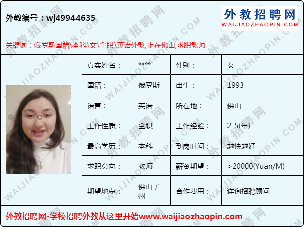 俄罗斯外教,女外教,全职外教,英语外教,有幼儿园、培训机构和小学的经验,戏剧表演经验,求职佛山和广州职位。