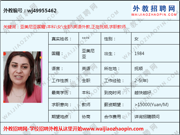 亚美尼亚外教,女外教,全职外教,英语外教,英语德语-本科,tefl , 经验特别丰富,求职地需协商。