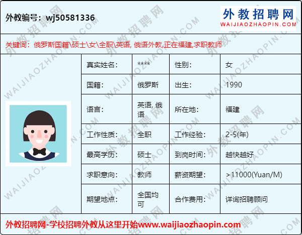 推荐理由:俄罗斯外教,硕士,在福建,求职城市不限