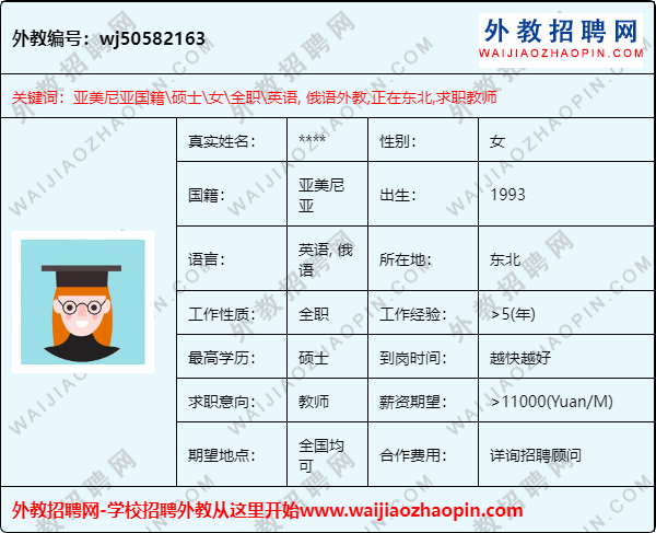 推荐理由:亚美尼亚外教,有TEFL外教,经验非常丰富,硕士,求职不限