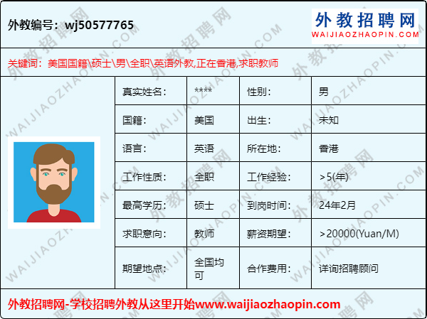 推荐理由:美国外教,硕士,经验非常丰富,求职初高中职位