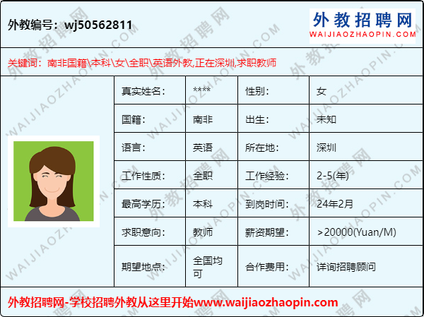 推荐理由:南非外教,在深圳,发音好,有经验,求职城市可协商