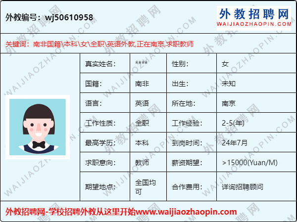 推荐理由:南非外教,在南京,经验丰富,求职周末休息的职位