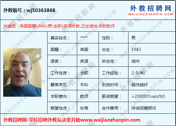 英国外教,文教类工签,本科,经验十分丰富,在杭州,求职杭州和绍兴职位