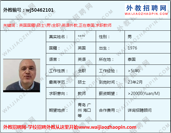 英国外教,硕士,在国外,5年以上的教学经验,求职青岛、广州、海口等职位