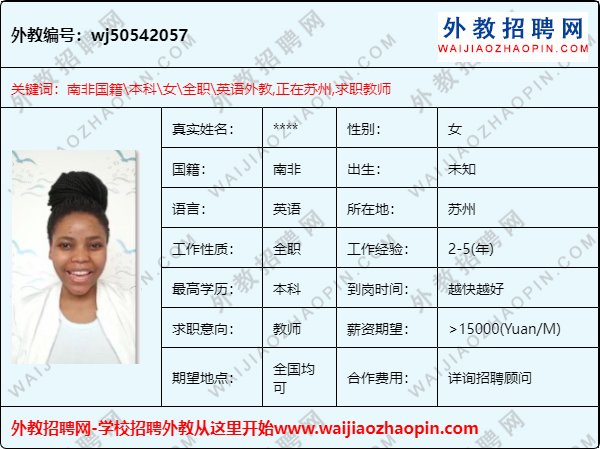 推荐理由:南非外教,工签转聘,在苏州,本科,有经验,求职城市不限